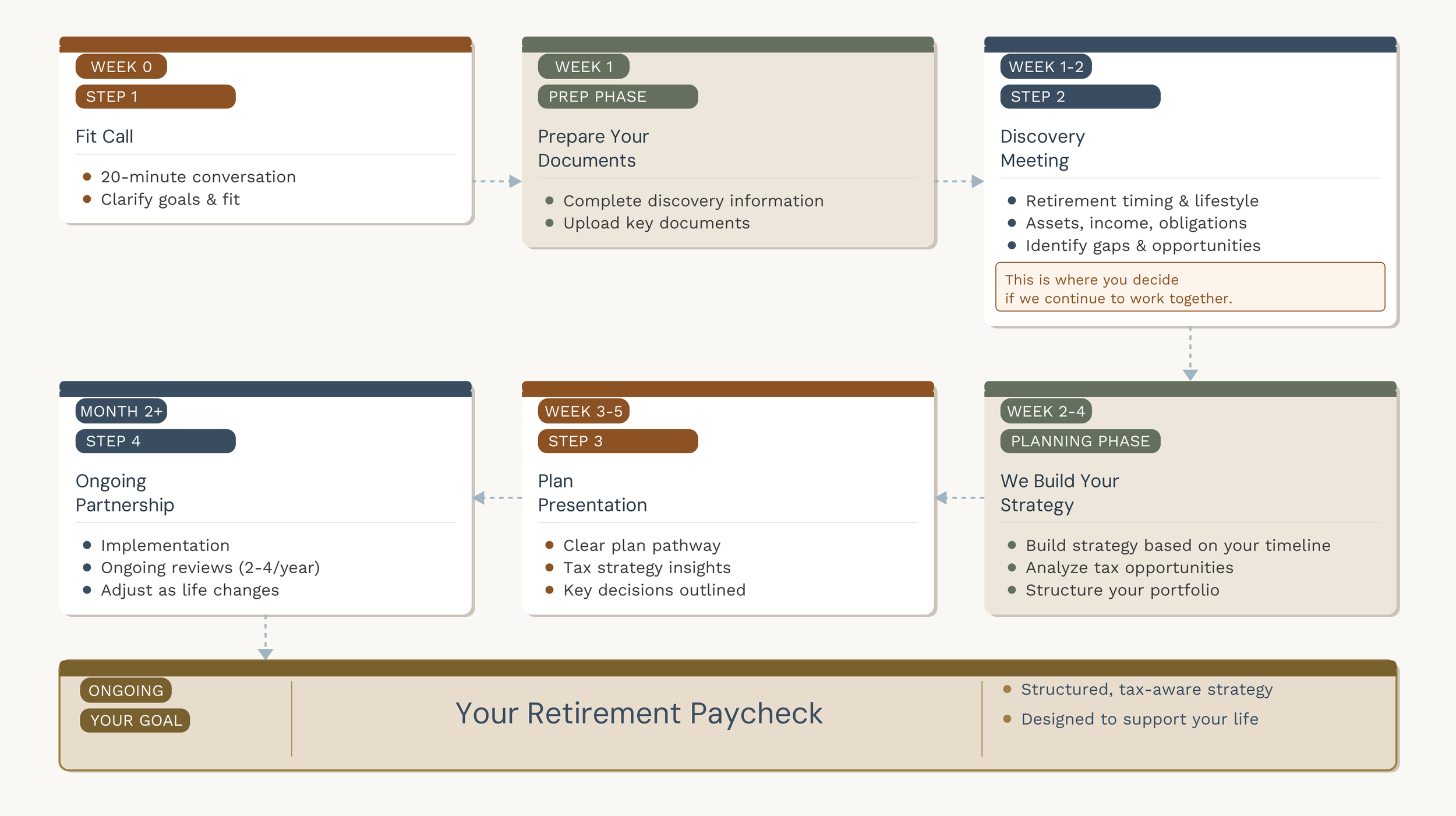 Here’s how we turn your savings into a coordinated income and tax plan, from the first conversation to ongoing guidance